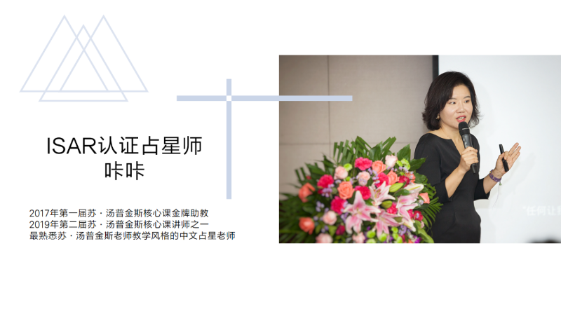 2017年第一届苏·汤普金斯核心课金牌助教、2019年、2021年核心课中与苏·汤普金斯老师及大卫·瑞雷老师联合授课的ISAR认证占星师咔咔。