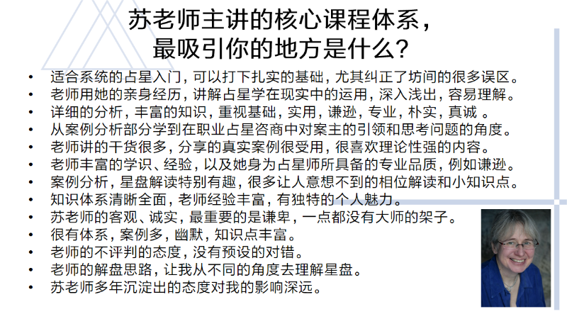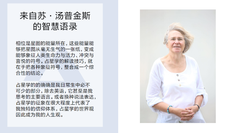 作为最熟悉苏·汤普金斯老师教学风格的中文占星老师,咔咔老师将在2024年第三届苏·汤普金斯核心课中负责教授部分课程,帮助学员更好地梳理知识架构,了解学员的学习进度和疑问,补充丰富占星咨询的中国案例。