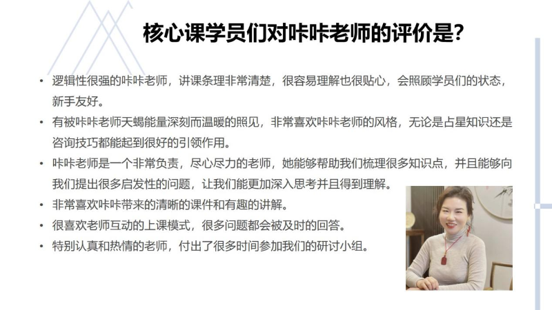 咔咔老师跟随多位世界知名占星老师学习,了解各家所长,且多年的外企管理职业生涯让视野开阔,逻辑清晰;同时她又是中国本土最早一批独立职业占星师,非常了解本土占星特色和客户需求。她的风格深刻而温暖。