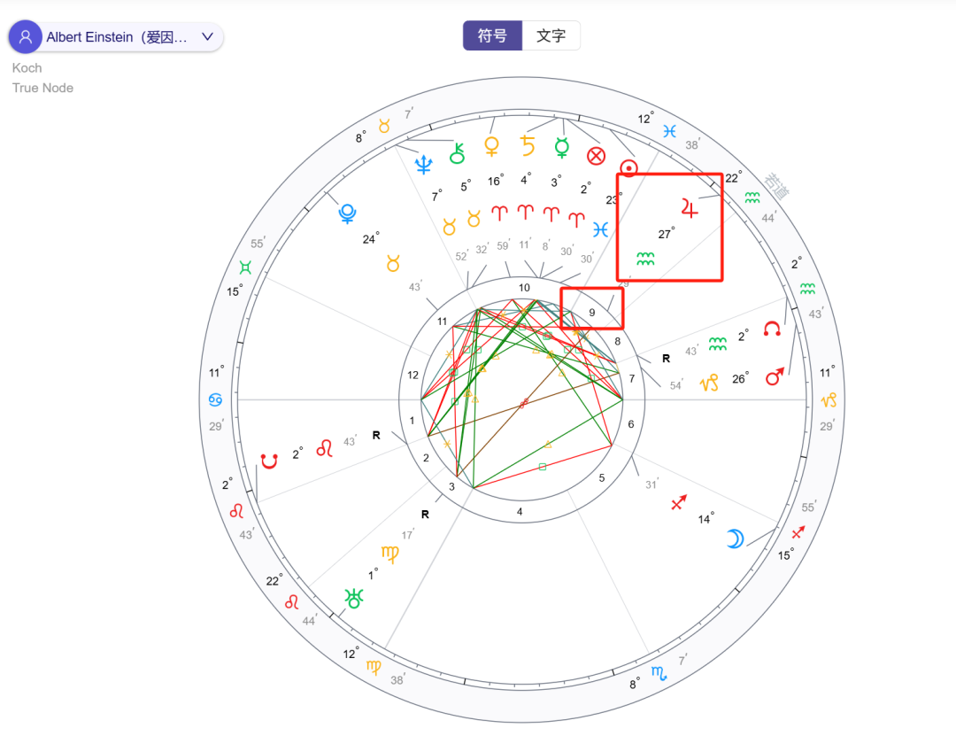 现在就来探索这个礼物(或双重礼物)是什么吧。先享受你的木星的宫位中这第一个资产,然后沐浴木星所落星座的光芒。木星只有一个,但是,好吧,有两部分供你阅读!若道君:你可以在app store或者应用商店搜索“若道”下载app,输入个人档案,查看本命盘(也可以使用其他星图软件),找到木星符号♃,然后看该符号落在出生星图的第几宫以及什么星座,对照下文查看。例如下图中,爱因斯坦的个人星图的木星水瓶座落在第9宫。