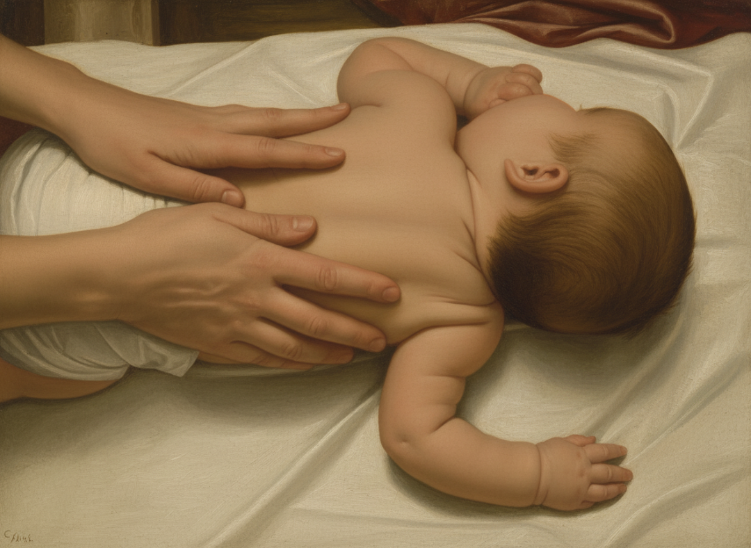 母亲抚触着婴儿的脸颊、小鼻子、嘴唇、身体和四肢......
