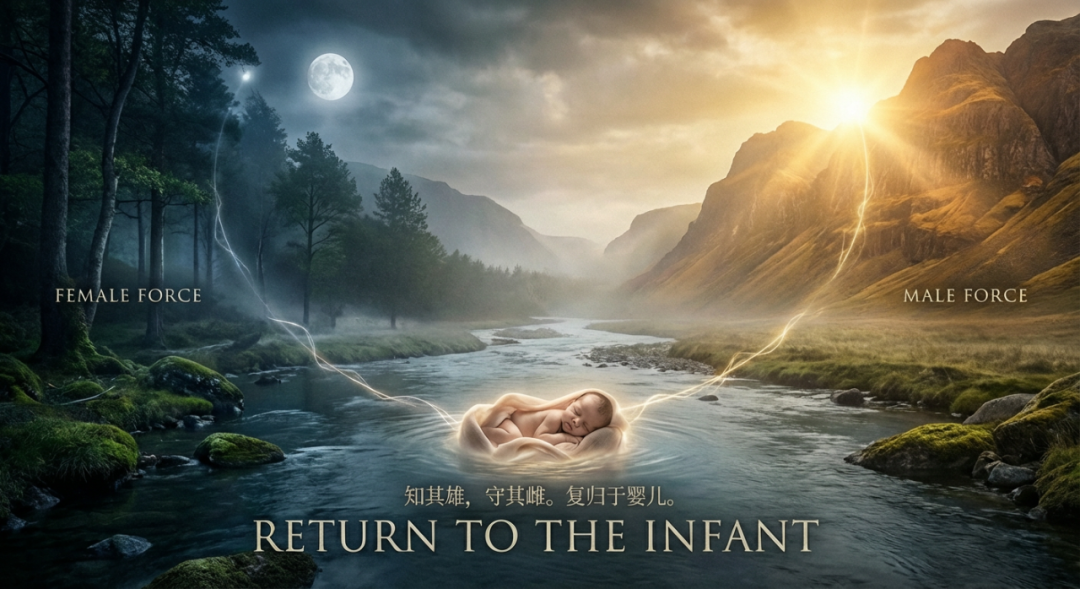 “知其雄,守其雌,为天下溪。为天下溪,常德不离,复归于婴儿。”深知什么是雄伟刚强之道的好处,却宁可安守在雌柔软弱的位置,甘愿做天下的溪涧。甘愿作天下的溪涧,常道美德自然就不会离失,如同回到婴儿般纯朴的状态。守雌且要知雄,知雄而后守雌。此处的知守,是显隐运动,无关非此即彼地取舍。互为有度的节制,以防招致极端的祸患;此处的复归,亦并非单向,其终即是始的无极。负阴而抱阳地,局部侵入并隐藏于对方的脏腹深处。不再是对宫的二元对立,而是相辅相成地共生。知雄与守雌,简直是为摩羯巨蟹对宫量身定制的,参与社会和生活的准则;最终两者都发现自己被雄雌不离的滋润之道,即婴儿所环绕。旋转中,包裹他们的圆圈消融了,卷入了永恒的整合。