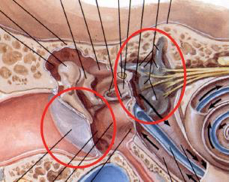 这样,耳朵与下颚连接,耳咽管从中耳延伸到耳朵,这就是为什么飞机起飞下降时,人们如果耳朵(耳鼓)不适,可以通过张大嘴巴或咀嚼口香糖等张大细小的咽鼓(咽喉-鼓膜)管,改变鼓膜处的压力,缓解不适。