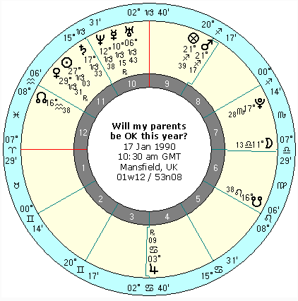 土星代表提问者的母亲(十宫主),土星本来就是一颗老年的、虚弱的行星。提问人母亲的一宫(十宫,转宫的理论大家都应该熟悉了吧?不熟的自己找文章看),是象征健康和活力的宫位,六宫是潜在的疾病。六宫主水星(提问人母亲的六宫,就是十宫的六宫,也就是原盘的三宫)飞一宫,表明她母亲受疾病困扰。同时水星逆行,表示会旧病复发并且不是那么容易就能治好的。水星落在角宫宫位(十宫),此疾病能够造成较大的伤害。月亮在她母亲的十宫,十宫关系到治疗的情况,但宫内月亮受群星相刑,宫主金星逆行被太阳“烧”着,治疗效果会很不理想。海王与天王(分离,突变)在她母亲的一宫,进一步影响了她母亲的健康。另外,她母亲的八宫主月亮与象征着损失的土星相刑,更让人感觉到她母亲被治愈的希望不大。