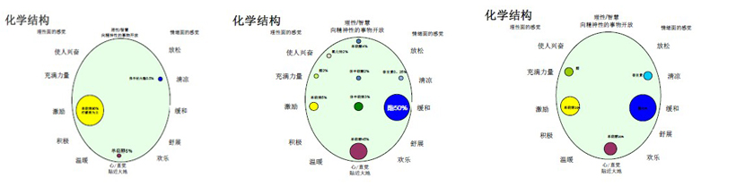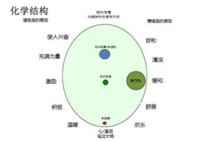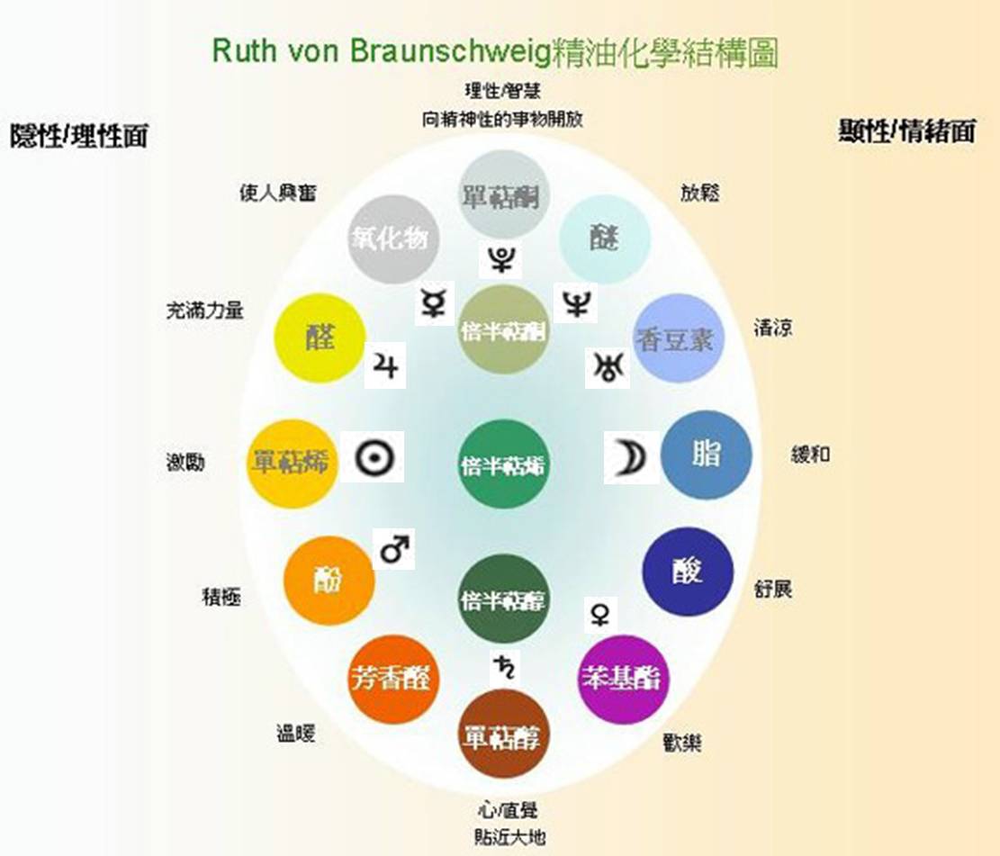 现代芳疗学家以类似的生化结构将精油进行大类划分。著名的“茹丝的蛋”--德系芳疗蛋形图,即由德国芳疗家Ruth von Braunschweig发明的化学结构图,展示了每款精油化学成分的分布,旨在用类化后的化学组合来定义其不同的身心灵疗愈类型,使各大类的比重及协同作用一目了然。
