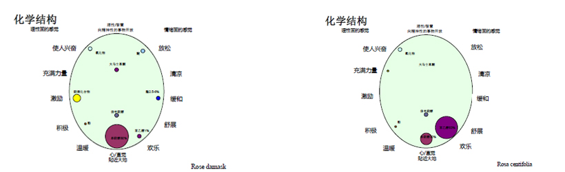 不同品种的玫瑰,因其富含化学成份的迥异,而呈现出截然不同的芳香气质。化学成分主要区分于:千叶玫瑰富含约60%的苯基酯,而大马士革玫瑰以80%的单萜醇为显著。如上所推,苯基酯对应金星,故千叶玫瑰的香气馥郁扑鼻,并具天秤座金星的女性华美艳丽,及金牛座金星的浓厚感官口味,芳香印象为色香粘稠;而单萜醇对应土星,所以,大马士革玫瑰因此更具落定感与朴素的清新,芳香印象为色香寡淡的收敛知性。