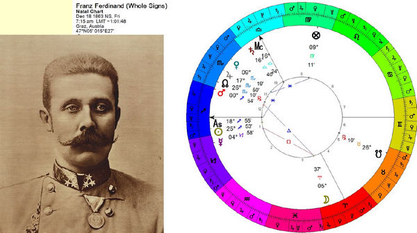 在此我想要提到古代占星学中的一种预测方法,它并没有普遍地被现代的人知道,但是很多印度占星师用这个方法。这种方法分析哪颗行星在哪段时间去守护这个人,这个可以称为行星阶段。这种方法很简单,每一年都会有一个小限。比如说,在斐迪南大公的星图中,他出生时小限的上升点是在射手座18度55分,而1岁的时候就移动一个星座,是摩羯座18度,2岁的时候就是水瓶座18度,以此类推。这类似于中国的属相,占星学就是每一年都有一个行星守护。这与木星的周期有关,因为木星差不多要花12年走一圈,所以这种技法可能就是把木星理想的周期变成12年,每一年都有一个星座。这个系统其实就只是在中世纪西方被运用,但是在中国好像一直流传下来了。当然在中国12年的周期用的象征是动物,不过原则是一样的。