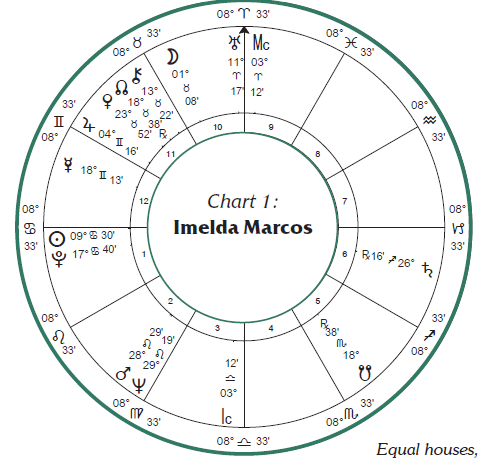 伊梅尔达·马科斯曾经是世界上最富有、最具权势的女人之一(太冥在巨蟹座),她被称为“铁蝴蝶”——一个出生卑微却最终坐上菲律宾第一夫人宝座的女人(见上图)。伊梅尔达挥霍无度,女王般随心所欲,在她的国家民不聊生时,她还过着奢侈的生活。她曾不带任何讽刺意味地说:“我必须要打扮漂亮,这样贫穷的菲律宾人才能从他们的贫民窟里仰望到一颗明星。”不是最讨人喜欢的忏悔,但我们别忘了她嫁给了一位冷酷的独裁者,公布戒严令,谋杀、监禁他的政敌。