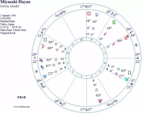 (宫崎骏出生于1941年1月5日,由于出生时间不确定,本星图选取时间中午12点,不影响星座、相位)