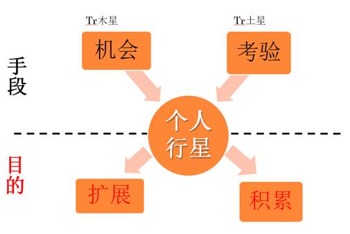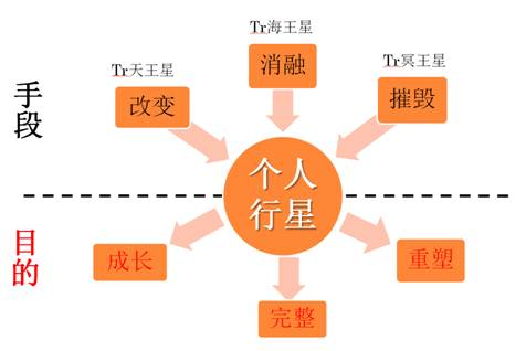 三王星是世代行星,由于行进速度慢,所以我们重点是看行进三王星与出生星图个人行星或四轴产生的相位,在解读上可以按照下图所示,从行进行星的手段和目的两个方面来理解对自我的影响(下图Tr:行进):
