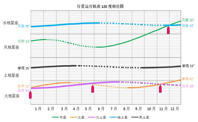 下面我会用我多年在个案预测咨询中一直采用的“行星运行轨迹图”的方式,帮助大家简单、通俗、直观了解2017年行星的运行情况和重要天象(相位),然后再根据不同上升星座和太阳星座简单列举不同的星座运势。