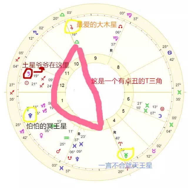 ⒈T三角就是三颗行星呈等腰直角三角形。如图,最近的天象中,木星在天秤座对分白羊座的天王星,还四分在摩羯座的冥王星,天王星同时与冥王星四分。(容许度8度)