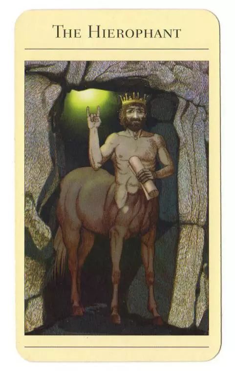教皇牌描绘的是一个奇怪的形象——人马,他的上半身包括双臂和头是一个男人,下半身则完全是马的样子。他的头发和胡子是褐色的,成熟的脸和仁慈的表情反映出他是一个教师或牧师。他的左手握着一卷书,书的寓意是表达成文的智慧。他的右手举起,做出古人表达赐福的手势。他的两侧都是石柱,身后是粗糙的巨石构成的岩洞,那是他的家,也是他的神殿。岩洞的顶部有一个环形的开口,光芒从那里倾泻进来,沐浴着他带着皇冠的头部。
