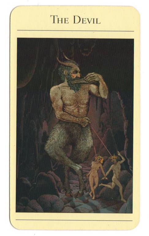 然而在神话中他不是恶魔,只是呈现出未经驯化和本能的特质,而且与道德无关。对身体和性冲动的恐惧或者着迷都制造了心理问题,它导致了人们在心理或身体的某个层面陷入麻痹或瘫痪的状态。恶魔牌暗示着阻塞和压抑,通常是在性的层面上的,其原因来自我们缺乏对潘的了解。尽管他很丑陋,可他却是伟大的万有——意即身体本身最原始的生命力,他不符合人类的道德标准而且非常粗糙和原始,却还是一个神祗。