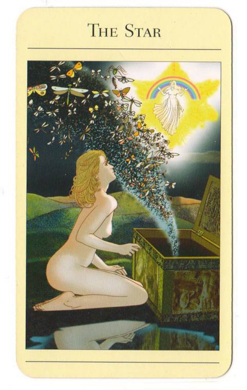 星星牌描绘的是一个留着金色长发的年轻美女,跪在一个打开的箱子前面,从箱子中飞出了一群有毒的昆虫,它们散入到黑暗的天空中。这个女人全神贯注地看着一颗盘旋于她上方的明亮的星星,在星星的中心处可以看到一个身穿白袍的女性形象。