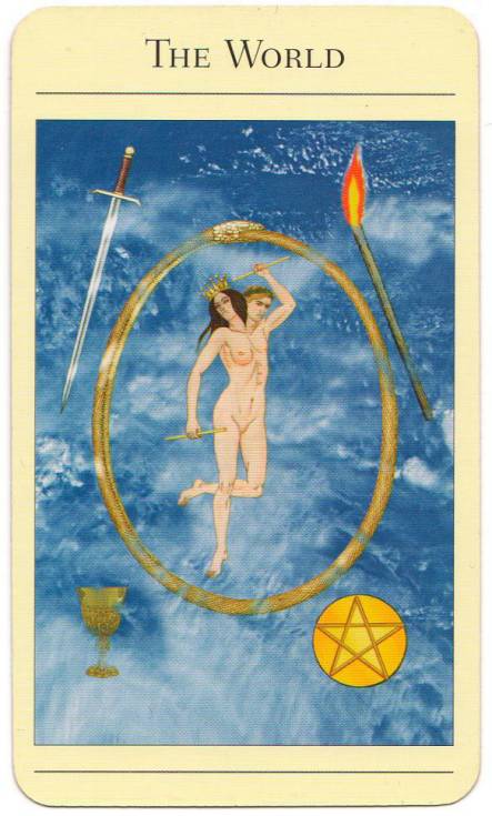 如果说赫马佛洛狄忒斯的雌雄同体身份是某种后天原因所致,那是因为整个大阿卡纳牌呈现的生命之旅中的各种经验导致了最后的完整性。母性的滋养和父性的道德、内在直觉和现实性表达、智识和情感、关系和独立、冲突与和谐、心灵和身体,我们内在这些两极的对立制造了生命中的各种挣扎,世界牌中雌雄同体的意象反映着这些对立力量的整合与和谐,世界之蛇的意象代表着无尽的生命循环。