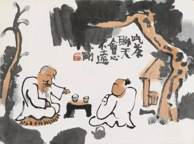 画家刘二刚是国内“文与画”俱佳的艺术家,他笔下这两位先生,在大树下盘腿而坐,啖一杯清茶,侃侃而谈。他们在谈什么,我们只能透过画面去想象,但画作流露出的谈笑风生的情趣却能透过笔墨,让人真切地感受到。