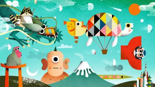 最后的这幅画,来自日本的意大利插画家乔达诺,整幅画色彩绚丽、表现夸张、充满童趣与想象力:流动的水母、背着降落伞的乌龟、大眼大耳长着触角的怪人、骑着巨龙的浣熊……这一切都激发着我们的好奇心。画面中的世界是流动而鲜活的,仿若一个充满双子能量的世界,引人入胜、充满了未知的可能。