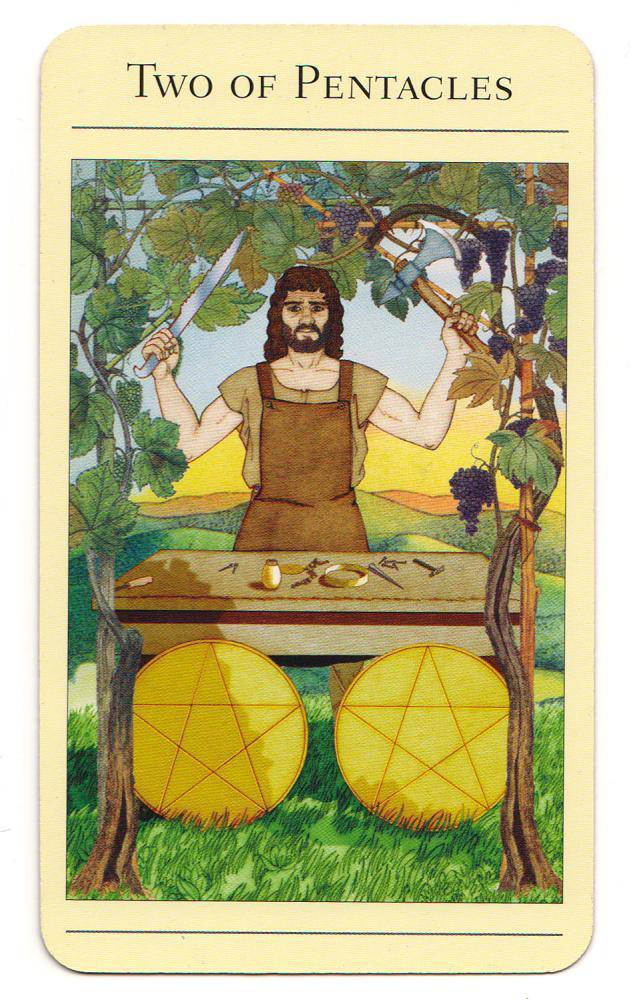 星币2呈现的是物质财富的改变或波动状态。这种波动并不意味着失去,而是把创造性的能量投入到许多项目里面。就像小阿卡纳的其它2号牌一样,星币1象征的原初之力在这里被极端化了,物质上的创造性必须被落实和引导出来。有句古语——“钱能生钱”,它非常适合星币2,因为必须要敢于冒险和利用现有的资产,才能够得到真正的收获。
