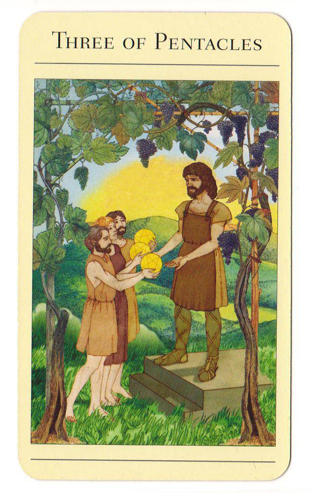 星币3和小阿卡纳的其它3号牌一样,反映着初始阶段的完成,在这里我们看到代达罗斯早期所付出的努力有了收获。初始阶段的完成意味着项目第一阶段的计划已经实现了,就像大厦的外部结构已经完成一样,其内部的结构和装修要等到日后继续进行。