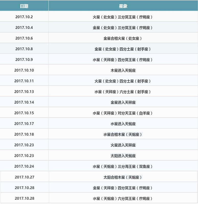 10月17日,水星会在本月率先与木星形成合相,27日太阳与木星合相。水星和太阳与木星的合相会是一个为未来13个月的天蝎之旅撒下愿望的种子的最好时机。我们可以通过阅读、讲座、旅游、写作等方式调频接受天蝎座的能量。这些内容可能是和心理学相关,与死亡、性、金钱相关的内容。侦探小说可能是个很好的消遣,里面包含了凶杀、情爱、金钱与人性的考验。