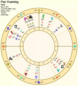 潘粤明出生于1974年5月9日北京。尽管没有具体出生时间而无法确认上升星座,但在他的出生星图里,一组非常扎眼的相位进入视线:金星白羊座精准对分冥王星天秤座,而这组金冥对分相,又分别与巨蟹座的土星、火星呈现四分相。