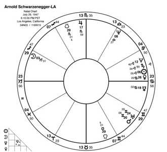 你会看到施瓦辛格的木星合相重置星图的中天(即事业成功)。他的金星合相重置星图下降点(即受到公众欢迎),他的土星和冥王星都与重置的中天成四分相(即获得政治权力)。