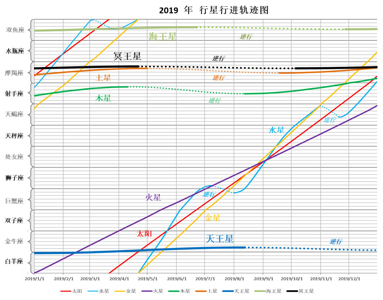 此图为2019年九大行星(除了月亮)全年在黄道12星座上面的行进轨迹显示,这是一个预览图,也是一个总览图,可以帮助我们迅速了解全年行星的状态,这里面我们可以比较直观看到的信息有: