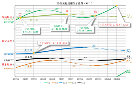 木星在2018年进入射手座后,在2019年将发生3次和海王星的四分相: