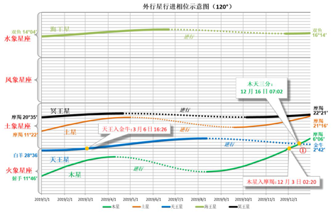 木星在2019年底进入摩羯座后,会和天王星于2019年12月16日第一次发生三分相。