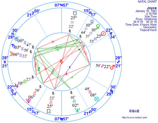 我不知道乔伊斯的性取向,而且我知道没有什么可靠的占星技巧可以从出生图中确定这一点。如果乔伊斯碰巧是一个女同性恋,那么我将要使用的异性恋语言也可以很容易地被调整来适应这一现实。